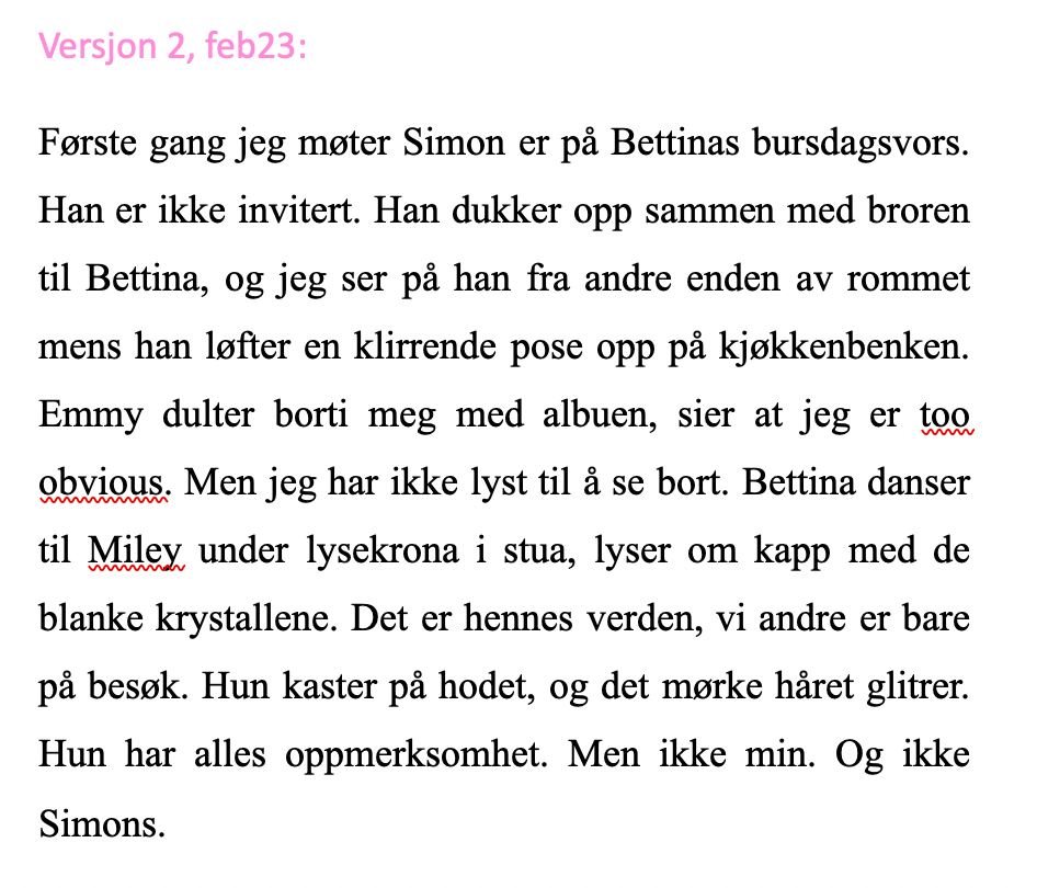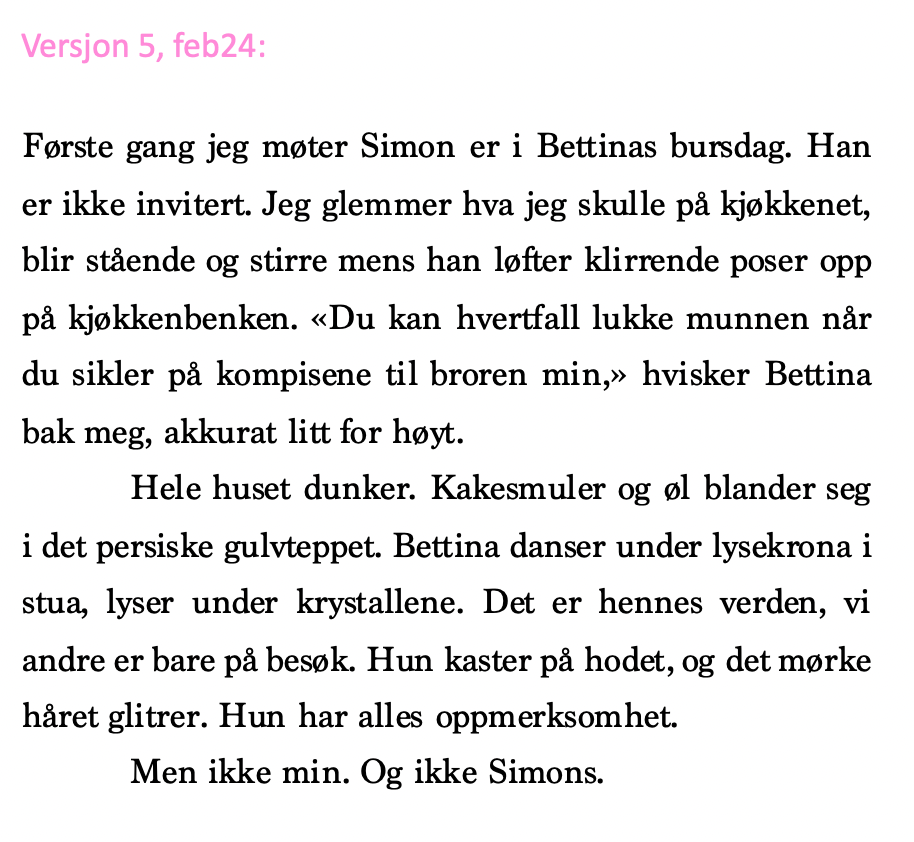Jeg skrev førsteutkastet sommeren 2022. Siden jobbet jeg med boken i to år før den til slutt gikk til trykk. Det var veldig varierende hvor mye jeg redigerte de ulike avsnittene/scenene, men åpningsscenen var den som forandret seg mest underveis. det er jo åpningsscenen; førsteinntrykket! Jeg hadde en klar visjon om hvordan jeg ville at åpningsscenen skulle fungere, og det satt ikke helt fra start. Her tar jeg for meg avsnitt for avsnitt i den første scenen av jeg angrer ikke på noe, for å se hvordan de ulike utkastene forandret seg!