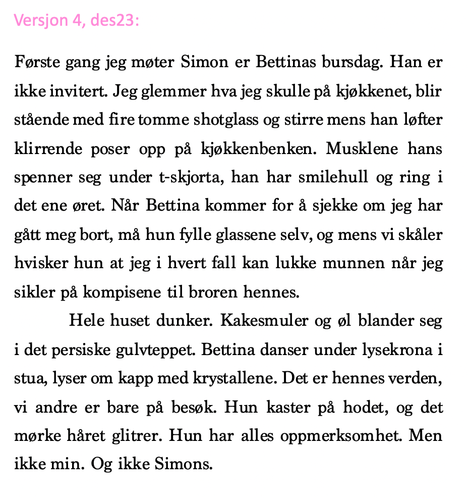 Jeg ville dumpe leseren rett inn i handlingen og settingen, Settingen skulle være en hjemmefest, og jeg vil at man skal få følelsen av det mens man leser. Samtidig ønsket jeg å informere om en del ting. Jeg-personens interesse for Simon-karakteren, en viss grad av aldersforskjell mellom disse, jeg-personens vennskap med Bettina, hennes sosiale status, jeg-personens forhold til familie. A LOT. Det med familie endte jeg opp med å vente litt med.