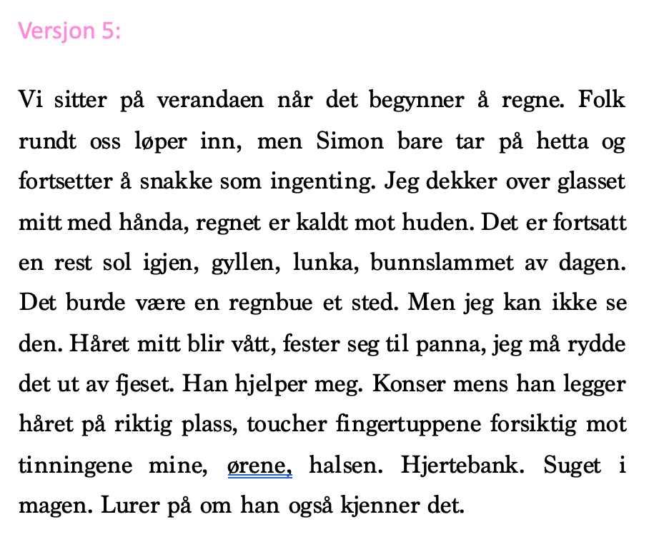 Jeg ønsker å male et bilde av at tiden liksom står stille, fordi jeg-personen henger med denne nye duden han har truffet. I de første fire utkastene var dette avsnittet likt; «store regndråper som henger lenge i lufta», da jeg først skrev det syntes jeg det hørtes fint og poetisk ut, men det er egentlig ganske uklart. Hva er det jeg egentlig mener? Ideen min om at tiden liksom står stille, eller at jeg-personen opplever å ikke bry seg om ting som skjer rundt ham, kommer klarere frem ved at det begynner å regne og folk løper inn, uten at det påvirker samtalen han er i.