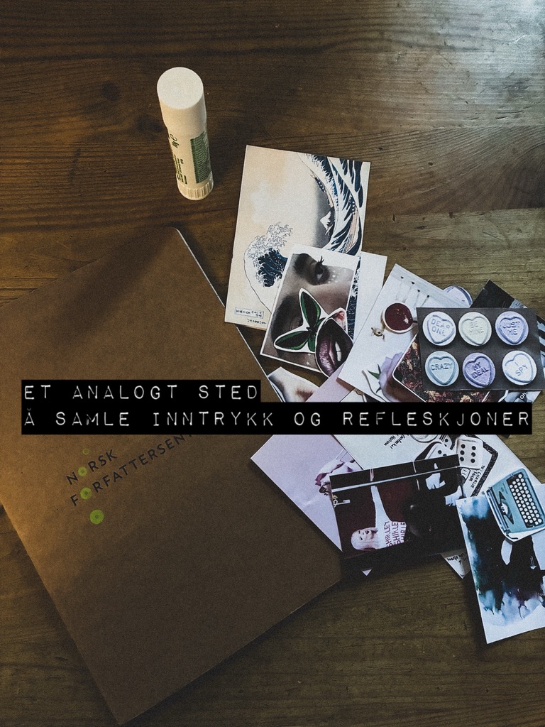Jeg ble akutt inspirert til å gjøre det samme nå. En skrivebok fra forfattersentrum, saks og lim, en liten collage. Her skal jeg notere tanker om media jeg liker (bøker filmer musikk you name it), i et forsøk på å fordøye det bedre. La ting synke inn litt. Samle inntrykk, reflektere, la meg inspirere.