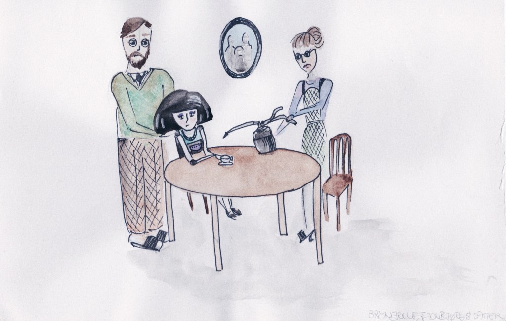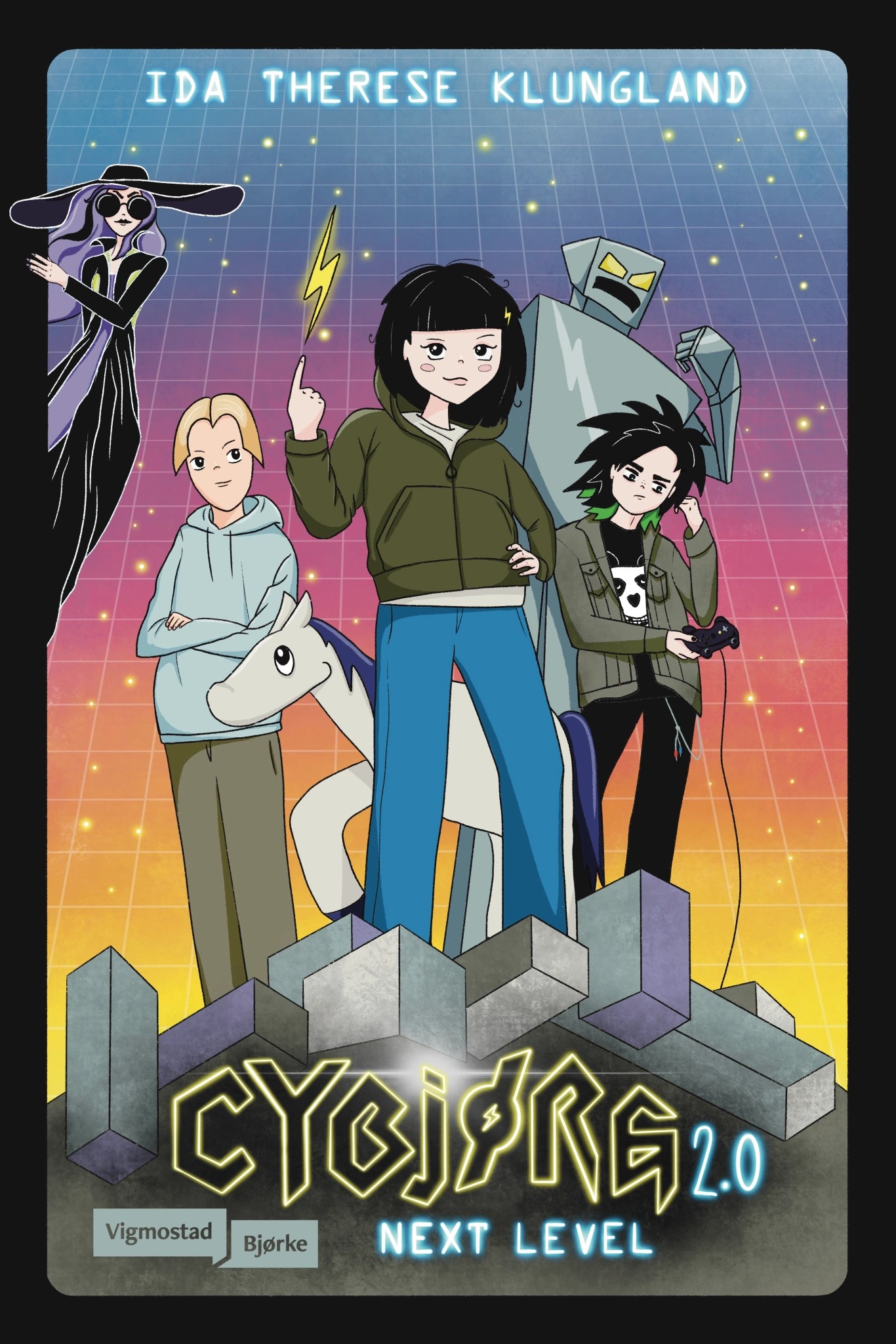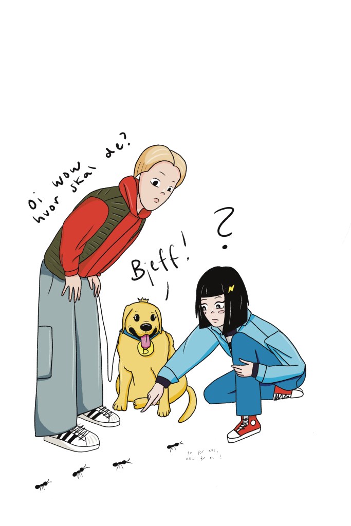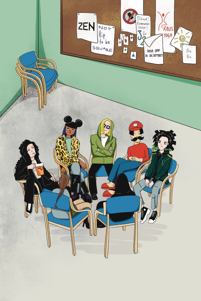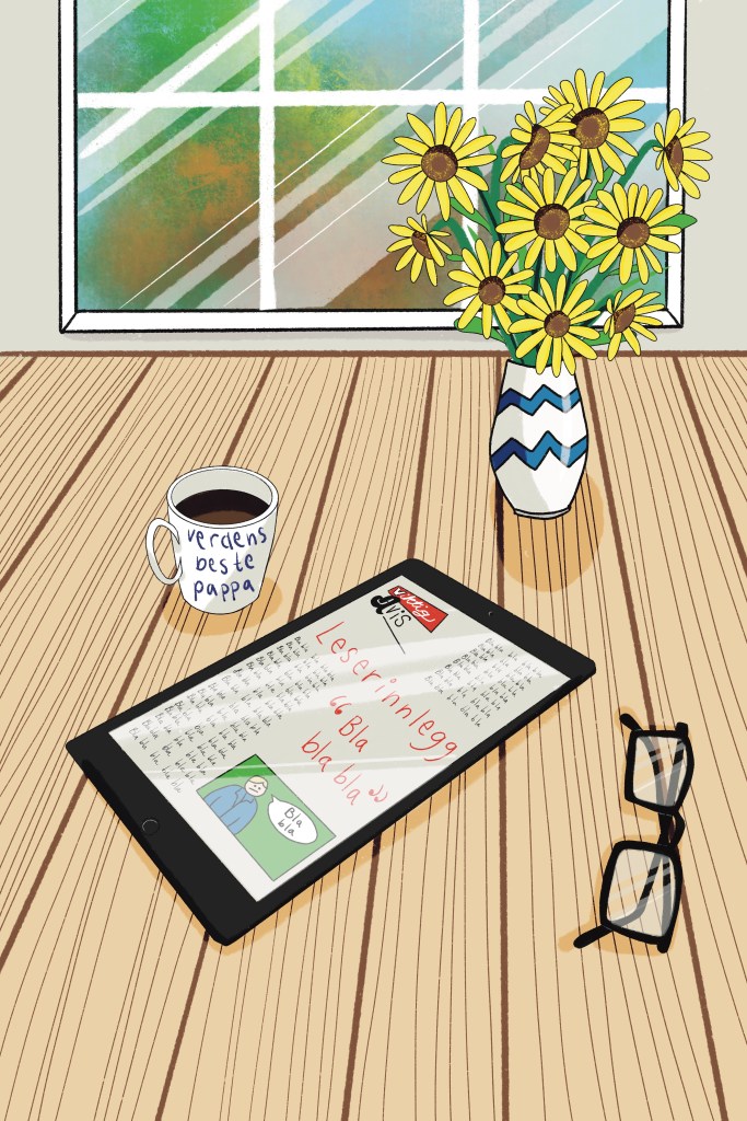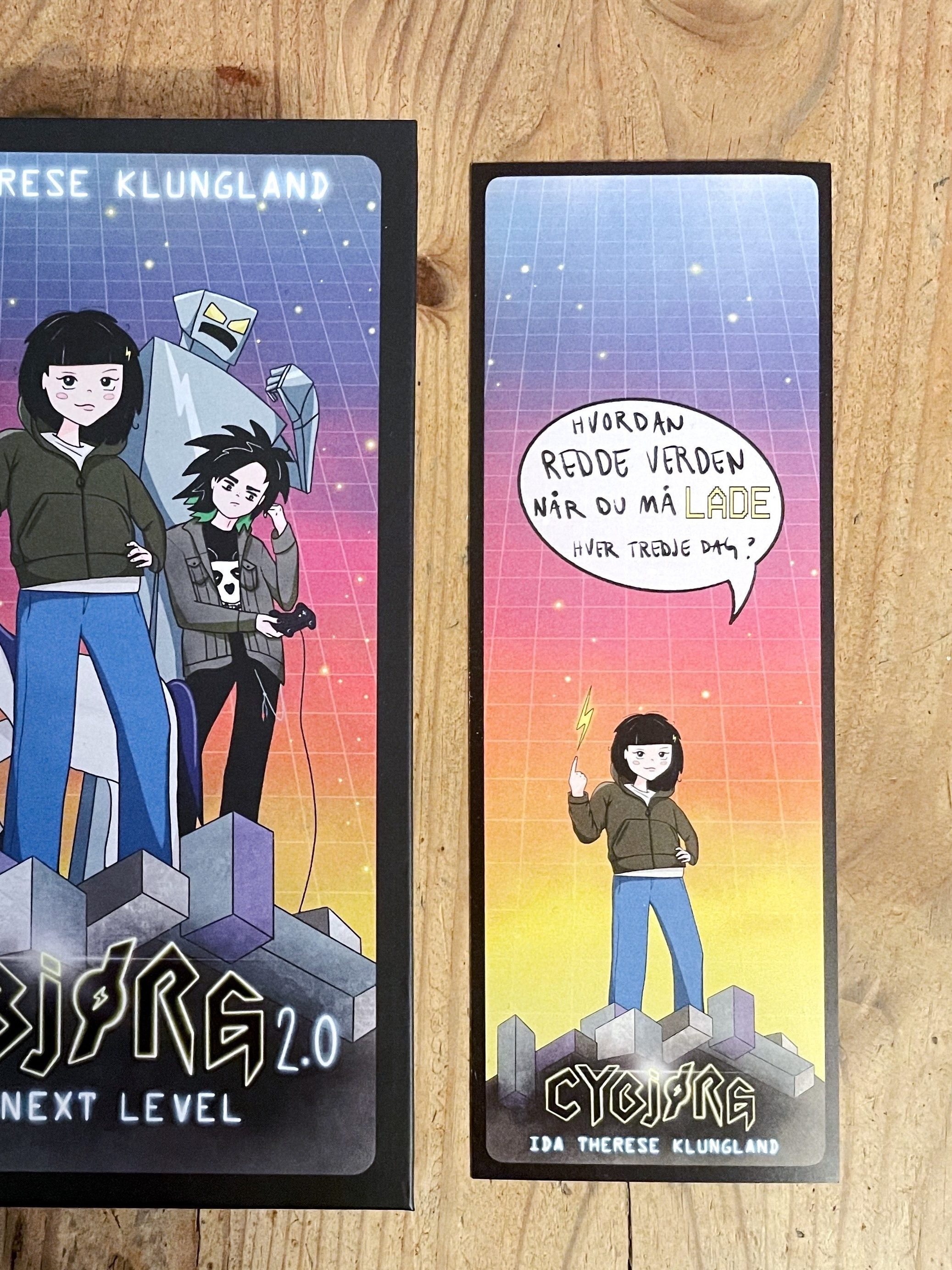 Da jeg et par år senere begynte å jobbe med et forlag om min første bokutgivelse, hadde jeg opprinnelig samme idé. Boken handlet om Cybjørg, en halv-digital cyborgjente. Jeg skisset illustrasjoner med akvarell, men endte (heldigvis) med å gjøre illustrasjonene digitalt. Takk til tatovør Ruben som viste meg tegneprogrammet Procreate, som jeg kunne laste ned på skole-iPaden min. Ja, jeg jobbet som lærer, og ja, jeg illustrerte mine første bøker på kommunens iPad! Usikker på hvor innafor det egentlig var. Men arbeidsverktøy er til for å brukes, ja? Uansett, jeg lærte meg digital tegning mens jeg illustrerte Cybjørg. Etter 100 illustrasjoner lærte jeg at det er forskjell på CMYK-farger og RGB-farger, og at man må forholde seg til noe som heter utfall. Bratt læringskurve, der.